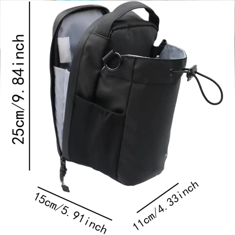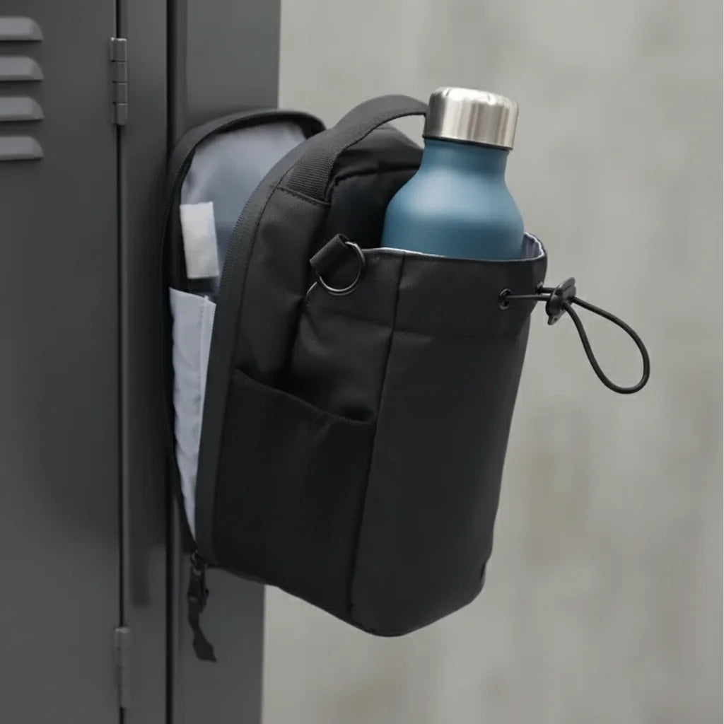 El bolso cuenta con un cierre de cordón ajustable. Esto asegura tu botella firmemente en su lugar, eliminando cualquier distracción. Tu hidratación, siempre protegida y accesible.